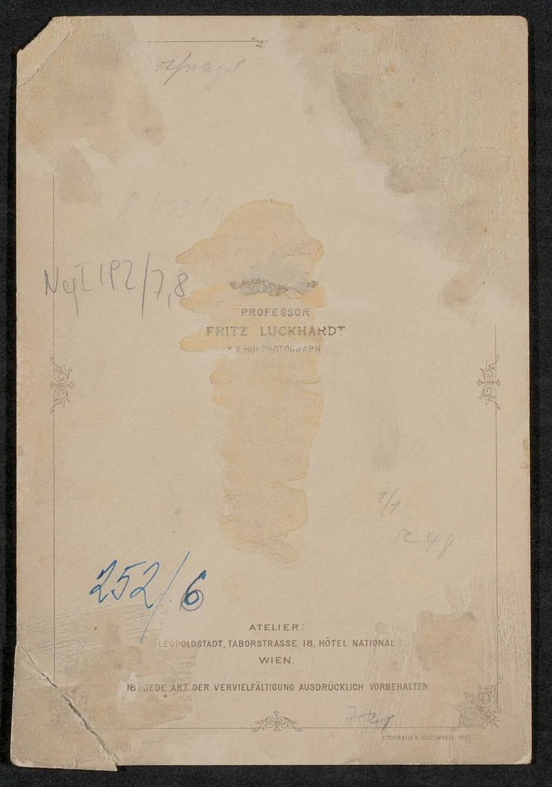 Die Fotografie wurde von Fritz Luckhardt, k.k. Hofphotograph, Wien, angefertigt. Neg I 124/32, 33 Neg III 55/8 Neg III 114/6