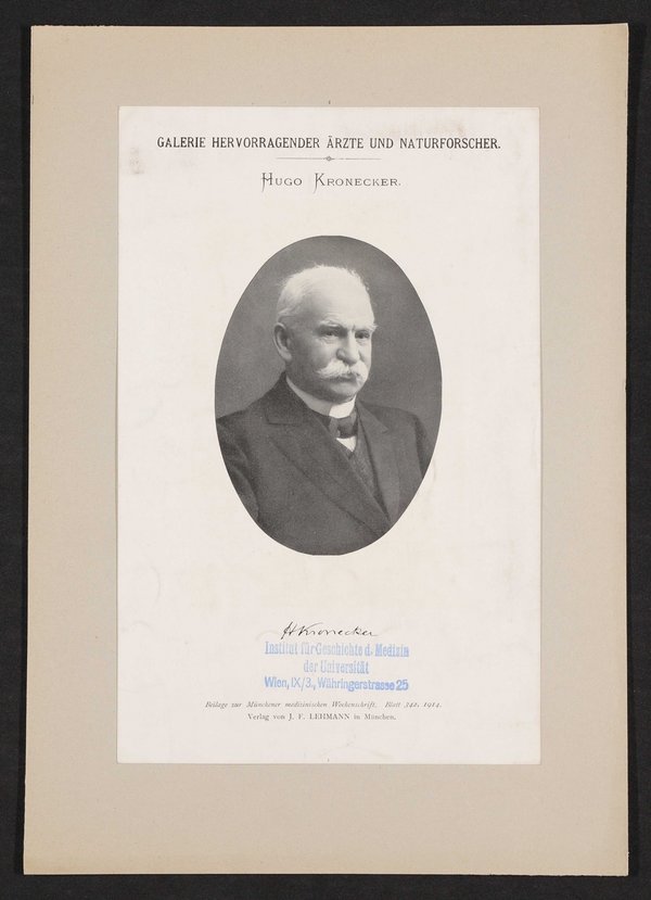 Auszug aus: Galerie hervorragender Ärzte und Naturforscher, in: Beilage zur Münchener medizinischen Wochenschrift, 1914, Bl. 342. Vorderseitig mit einem Stempel des Instituts für Geschichte der Medizin, Wien, versehen.
