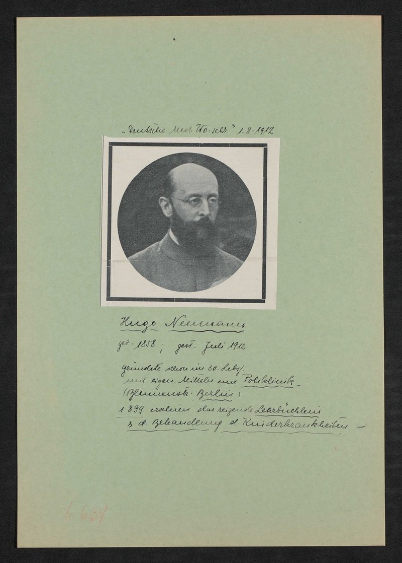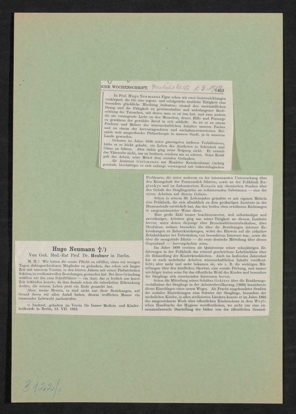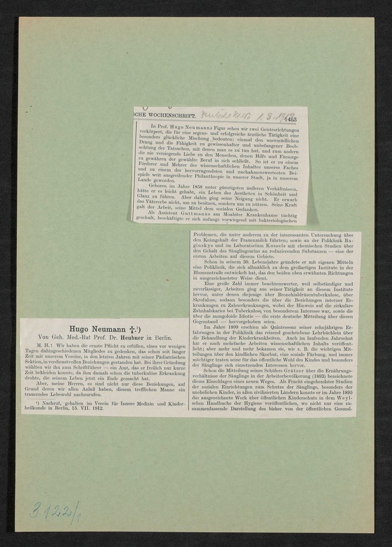 Auszug aus: Deutsche medizinische Wochenschrift, 01.08.1912. Der Zeitungsausschnitt ist aus einem Nachruf, welcher sich auf der Rückseite befindet.