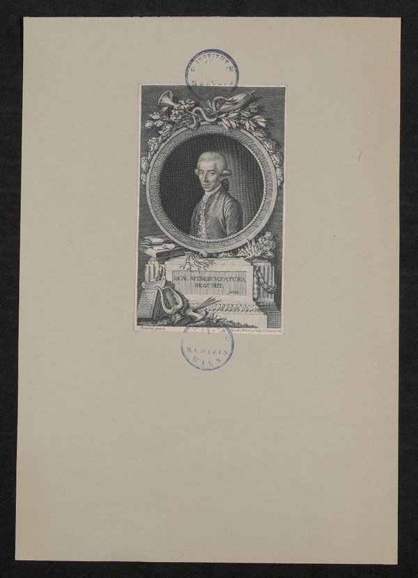 Der Kupferstich wurde von Jakob Adam auf Grundlage eines Gemäldes von Beirin angefertigt. Vorderseitig mit zwei Stempeln des Instituts für Geschichte der Medizin, Wien, versehen.
