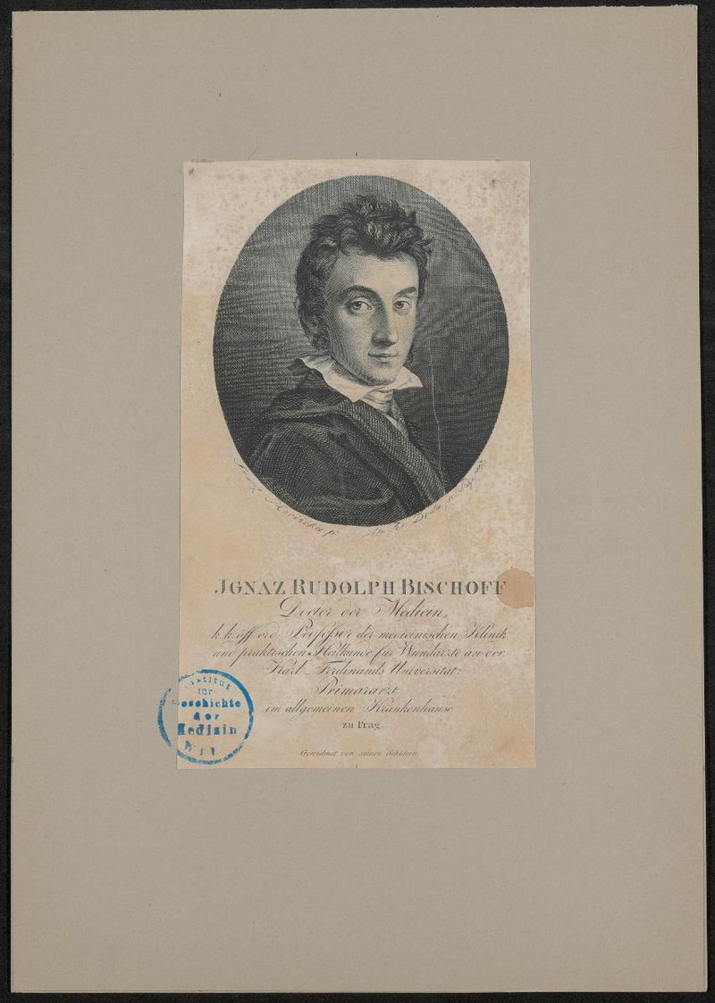 Der Kupferstich wurde auf Grundlage eines Bildes von Franz Horcicka durch Joseph Jan Alois Drda, Prag, angefertigt. Vorderseitig mit einem Stempel des Instituts für Geschichte der Medizin, Wien, versehen. Neg (9x12) 1268