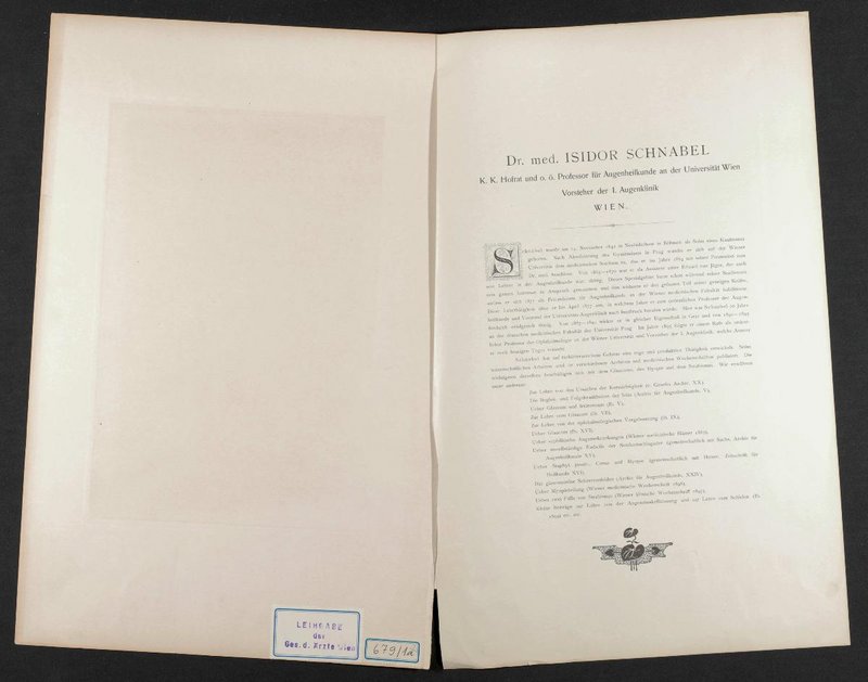 Die Lithografie wurde im Adolf Eckstein Verlag, Berlin-Charlottenburg, verlegt. Rückseitig befindet sich ein Stempel der Gesellschaft der Ärzte, Wien. An der Druckgrafik ist ein gedruckter biographischer Text zu Isidor Schnabel angebracht.