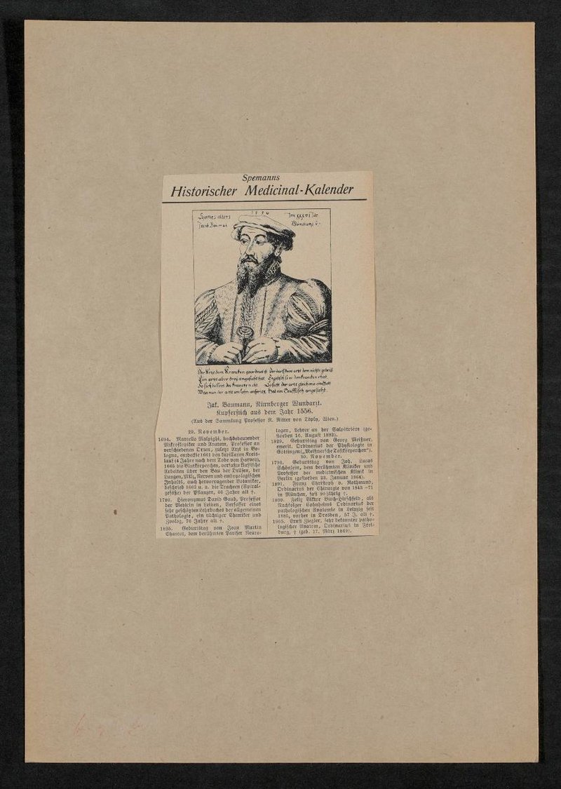 Auszug aus: Spemanns Historischer Medicinal-Kalender. Die Vorlage stammte aus der Sammlung Robert von Töply, Wien. Die originale Zeichnung wurde von Virgil Solis angefertigt.
