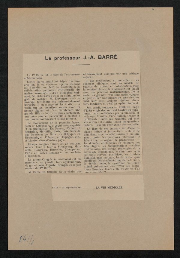 Der Ausschnitt ist der französischsprachigen Fachzeitschrift La Vie Medicale, Nr. 18, 25. September 1933, entnommen worden.