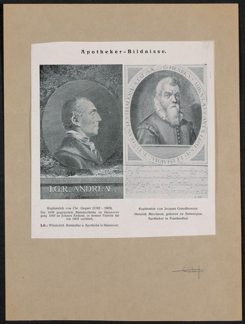 Auszug aus einem Artikel zu Rathausapotheke und Ratskeller in Hannover von Wüstefeld, in: Hannoversche Geschichtsblätter, Bd. 2, 1899. Kupferstich von Johann Andae von Christian Gottlieb Geyser, Kupferstich von Heinrich Mirolaeus von Jacques Grandhomme angefertigt.