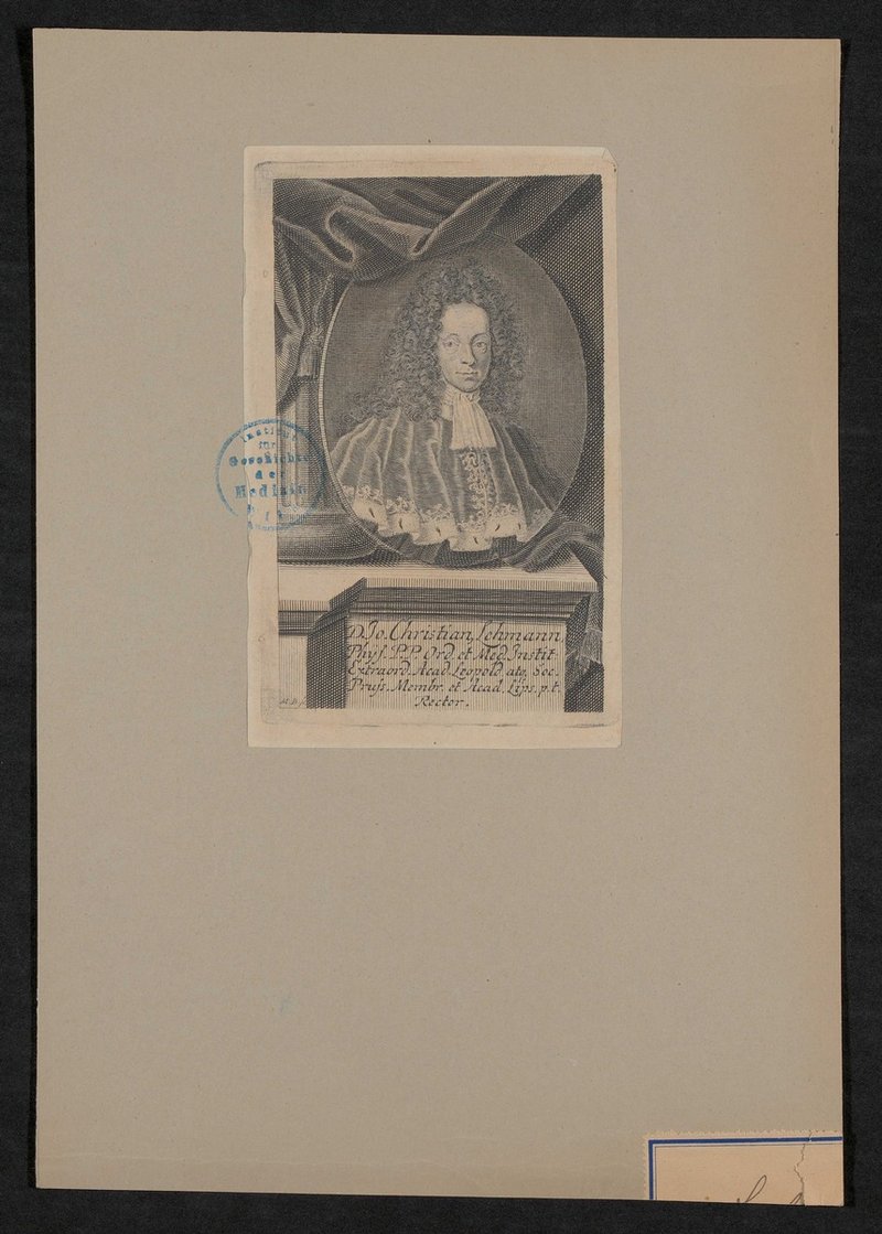 Der Kupferstich ist von Martin Bernigeroth angefertigt wurden. Vorderseitig mit einem Stempel des Instituts für Geschichte der Medizin, Wien, versehen. Am unteren rechten Rand des Kartons sind die Spuren einer Etikette zu sehen, die vermutlich von Theodor Billroth beschrieben worden ist.