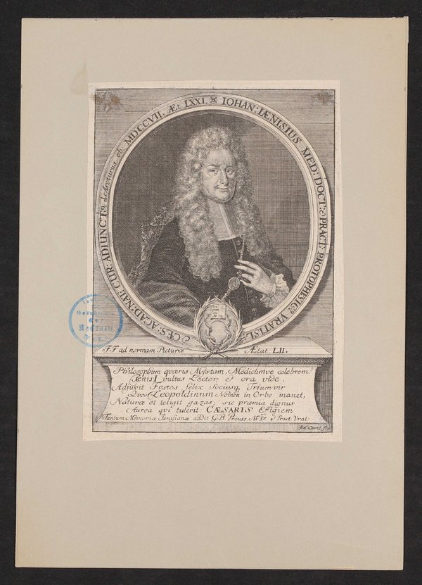 Der Kupferstich ist von Johann Oertl angefertigt worden. Vorderseitig mit einem Stempel des Instituts für Geschichte der Medizin, Wien, versehen.