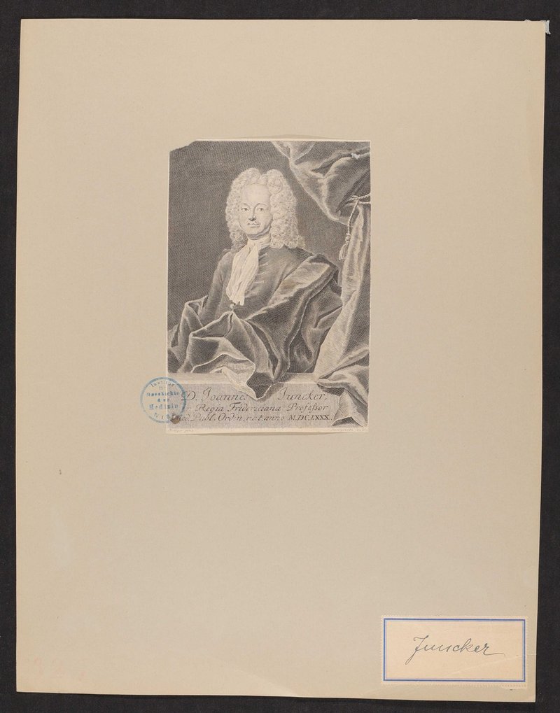 Der Kupferstich ist von Martin Bernigeroth angefertigt worden. Vorderseitig mit einem Stempel des Instituts für Geschichte der Medizin, Wien, und einem Etikett versehen, das auf die Herkunft aus der Gesellschaft der Ärzte, Wien, hindeutet.