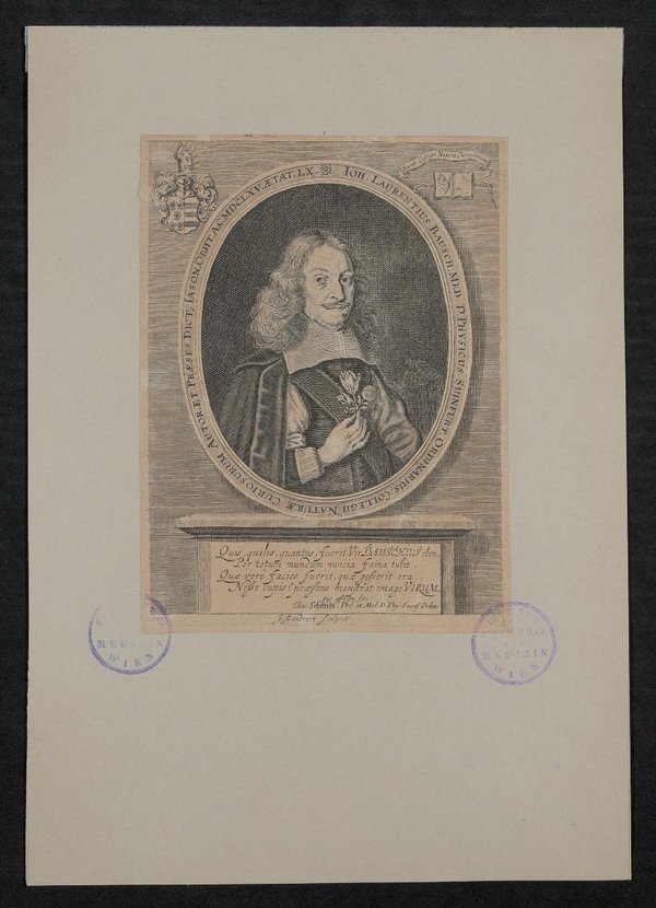 Der Kupferstich wurde von Jacob von Sandrart auf Grundlage eines Gemäldes von Elias Schmidt angefertigt. Vorderseitig mit zwei Stempeln des Instituts für Geschichte der Medizin, Wien, versehen.