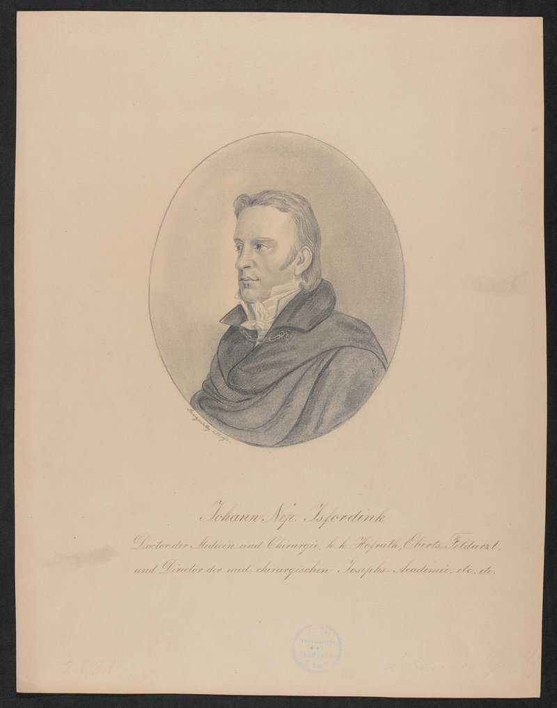 Vorlage war eine Lithografie, die von Joseph Lanzedelly dem Älteren angefertigt worden ist. Vorderseitig mit einem Stempel des Instituts für Geschichte der Medizin, Wien, versehen.