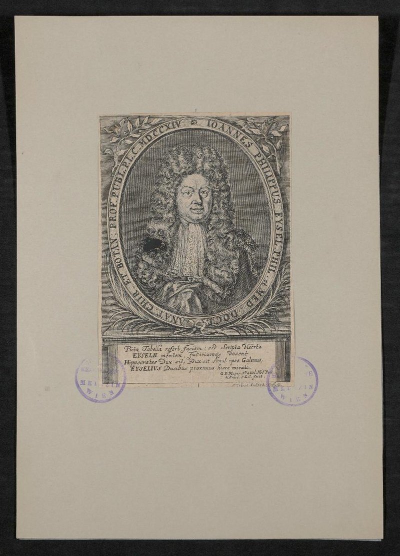 Der Kupferstich wurde von Jakob Petrus, Erfurt, angefertigt. Der Widmungstext stammt von Gottfried David Mayer. Vorderseitig mit zwei Stempeln des Institutes für Geschichte der Medizin, Wien, versehen.