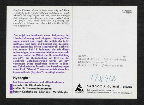 Die Karte ist an Gottfried Roth adressiert. Auf der Rückseite befindet sich eine pharmazeutische Werbeanzeige. Die Vorlage für das Porträt stammt aus dem historischen Bildarchiv Handke, Bad Berneck.
