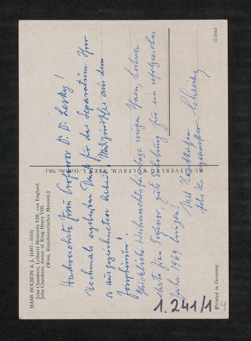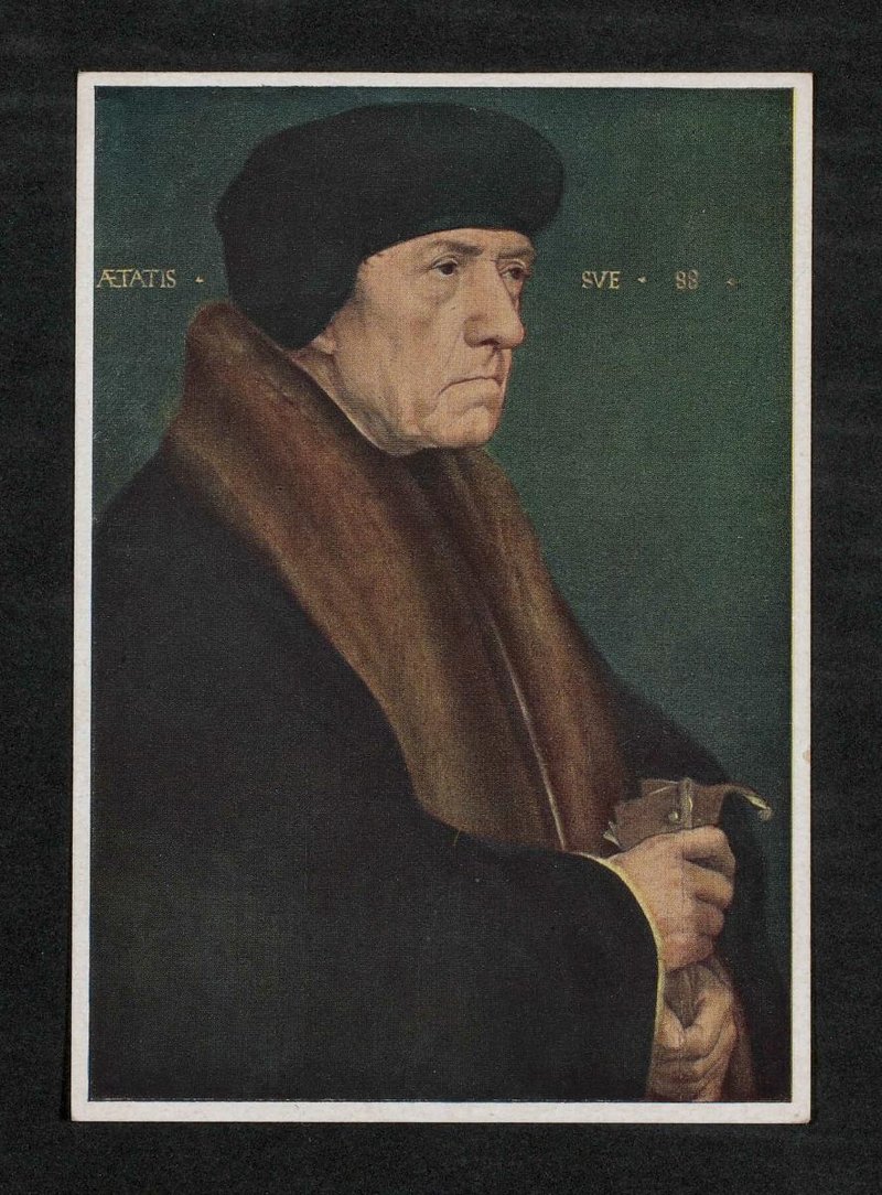 Die Angabe von 88 Jahren ist falsch. Bei dem Druck handelt es sich um eine Reproduktion eines Gemäldes von Hans Holbein dem Jüngeren. Das originale Gemälde befindet sich in der Gemäldegalerie des Kunsthistorischen Museums Wien. Die Postkarte ist im Kunstverlag Wolfrum, Wien, erschienen.