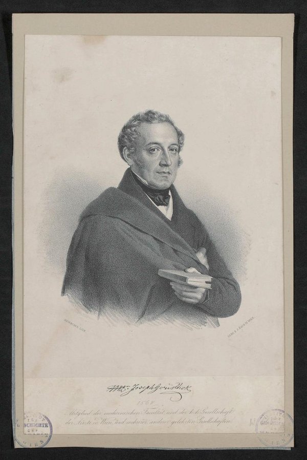 Lithografie wurde von Josef Kriehuber angefertigt und bei Johann Höfelich, Wien, gedruckt. Vorderseitig mit zwei Stempeln des Institutes für Geschichte der Medizin, Wien, versehen.