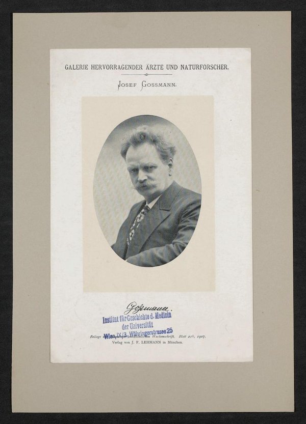 Auszug aus: Galerie hervorragender Ärzte und Naturforscher, in: Beilage zur Münchener medizinischen Wochenschrift, 1907, Bl. 216. Das Bild wurde im Verlag von Julius Friedrich Lehmann herausgegeben. Auf der Vorderseite befindet sich ein Stempel des Instituts für Geschichte der Medizin, Wien.
