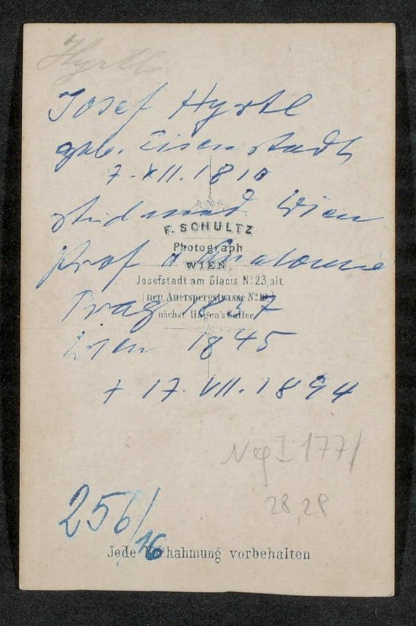 Rückseitig sind nachträglich lebensgeschichtliche Daten notiert worden. Die Fotografie wurde von Franz Seraphicus Schultz, Photograph, Wien, angefertigt. Neg I 177/28, 29 Neg III 133/4