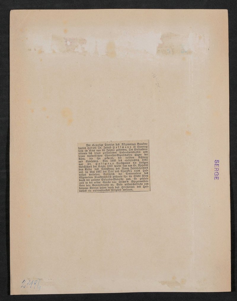Auf der Rückseite des Kartons befindet sich eine Todesanzeige für den Abgebildeten. Vorderseitig mit einem Stempel des Institutes für Geschichte der Medizin, Wien, versehen.