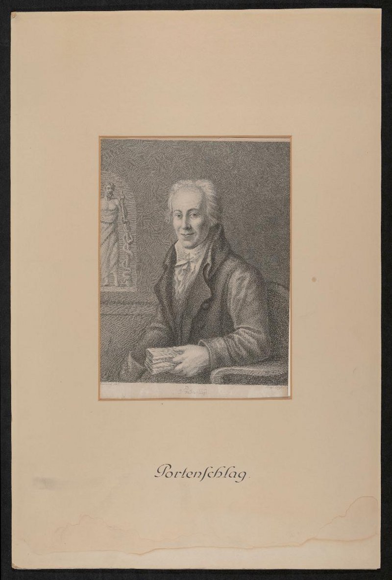 Der Kupferstich wurde von Blasius Höfel, Wien, nach einer Zeichnung von Gebuard angefertigt. Dem Bild liegt ein transkribierter Auszug aus der Familienchronik Portenschlag-Ledermayr bei.
