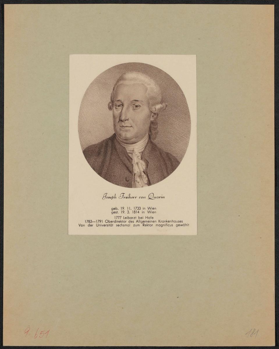 Unsignierte Lithografie aus: Portraiten-Gallerie berühmter Ärzte und Naturforscher des österreichischen Kaiserthumes, Fr. Beck´s Universitäts-Buchhandlung 1838. Die auf dem Karton fixierte Postkarte wurde von der Dr. Kutiak und Co., Arzneimittelfabrik, Wien, in der Bilderserie Naturforscher und Ärzte Österreichs vertrieben.