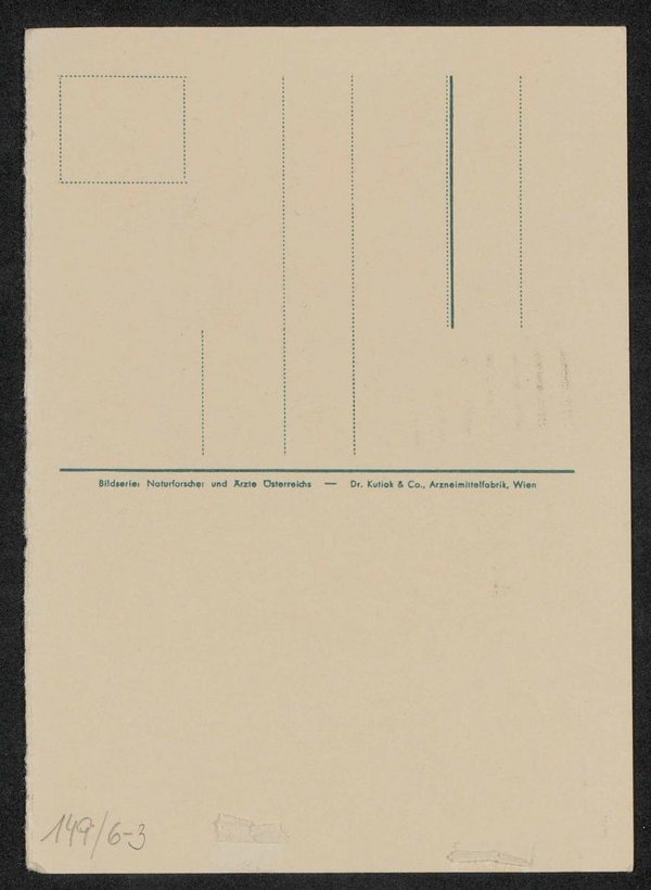 Der Kupferstich stammt von Paar. Die Ansichtskarte wurde von der Dr. Kutiak und Co., Arzneimittelfabrik, Wien, in der Bilderserie Naturforscher und Ärzte Österreichs vertrieben.