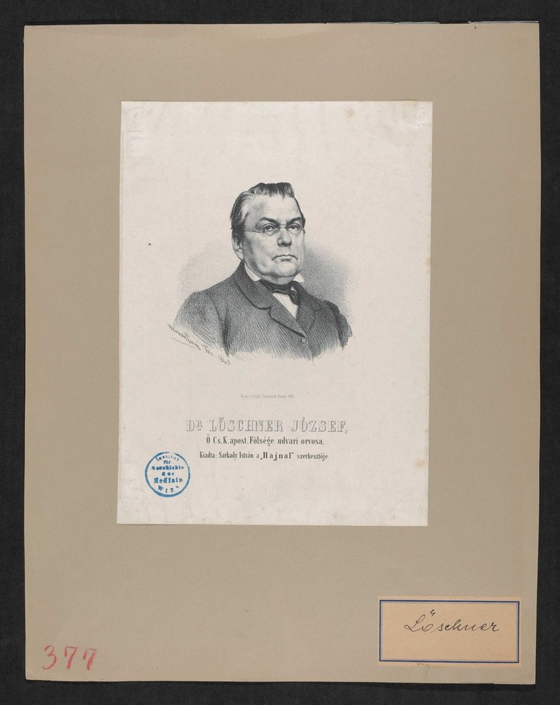 Die Lithografie ist von Jakob Marastoni angefertigt und bei den Brüdern Pollak, Budapest, gedruckt worden. Vorderseitig mit einem Stempel des Instituts für Geschichte der Medizin, Wien, sowie einer Namensetikette versehen, die vermutlich auf die Herkunft aus der Sammlung von Theodor Billroth hinweist.