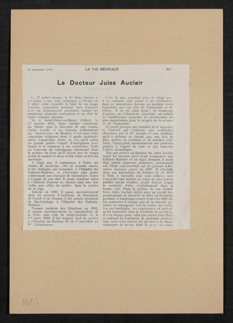 Der Ausschnitt stammte aus der französischsprachigen Zeitschrift La Vie Medicale, 10. September 1930. Mit einem Bericht über seine fachlichen Fertigkeiten auf der Rückseite.
