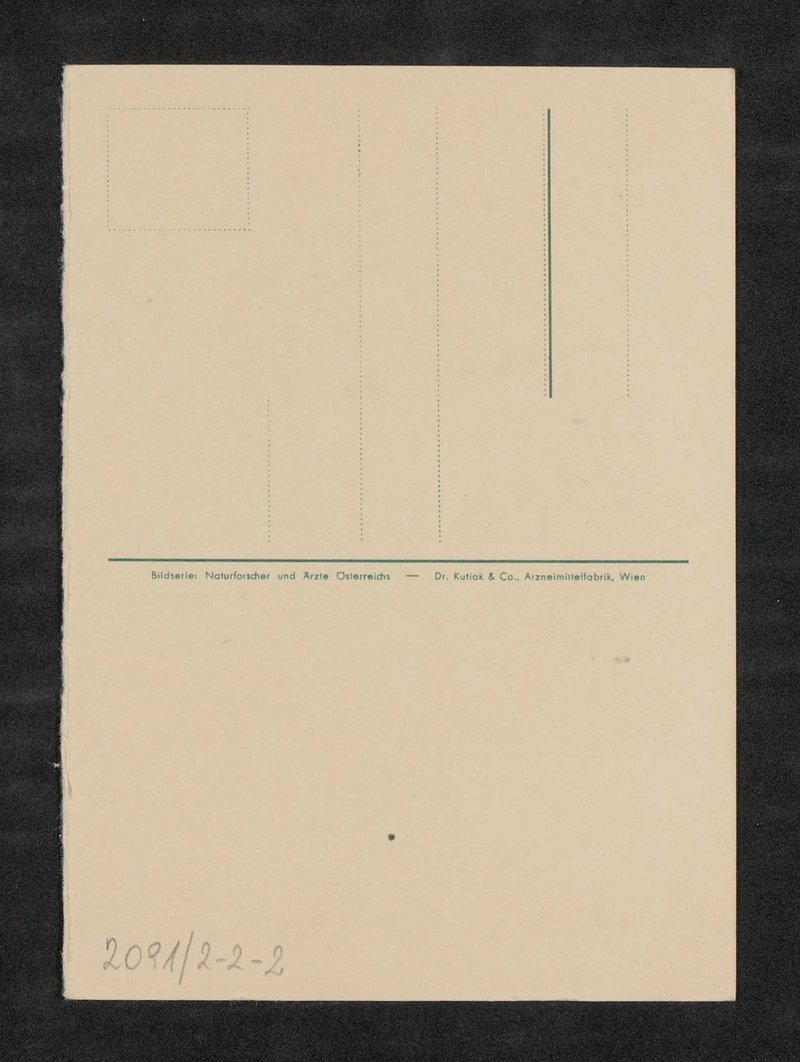Die Postkarte wurde von der Dr. Kutiak und Co., Arzneimittelfabrik, Wien, in der Bilderserie Naturforscher und Ärzte Österreichs vertrieben.