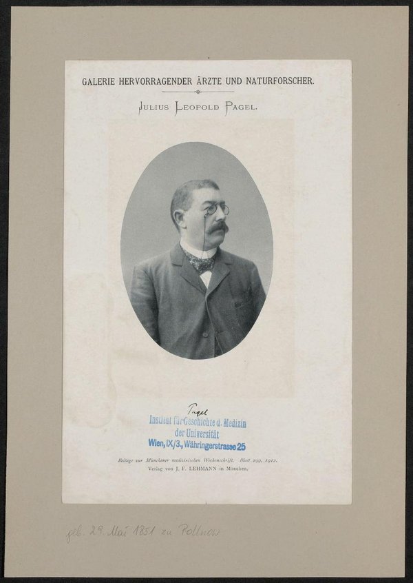 Auszug aus: Galerie hervorragender Ärzte und Naturforscher, in: Beilage zur Münchener medizinischen Wochenschrift, 1912, Bl. 299. Unter dem Bild befindet sich ein Stempel des Institutes für Geschichte der Medizin, Wien.
