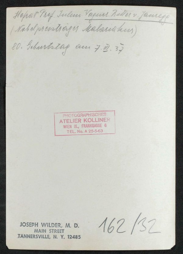 Die Fotografie wurde im Atelier von Grete Kolliner, Wien, angefertigt. Mit rückseitig angebrachtem Stempel von Joseph Wilder, Tannersville.