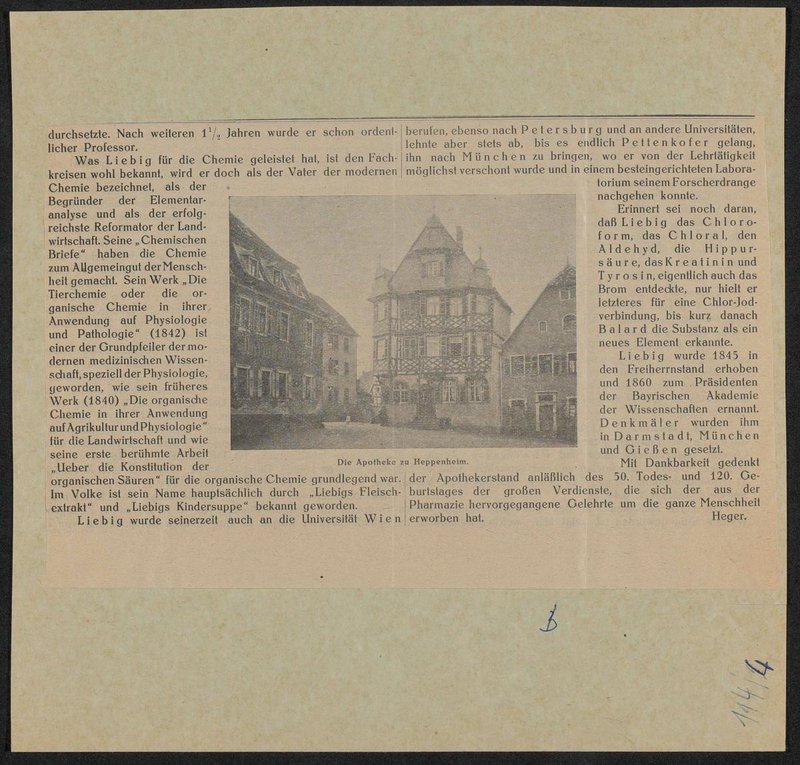 Auf der Rückseite ist die Apotheke in Heppenheim bei Heidelberg abgebildet.