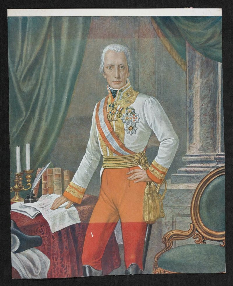 Vorlage war ein nicht spezifizierbares Gemälde. Der Druck ist teilweise ausgeblichen, weil er einmal gerahmt gewesen ist.