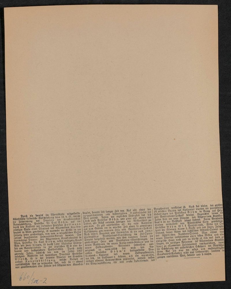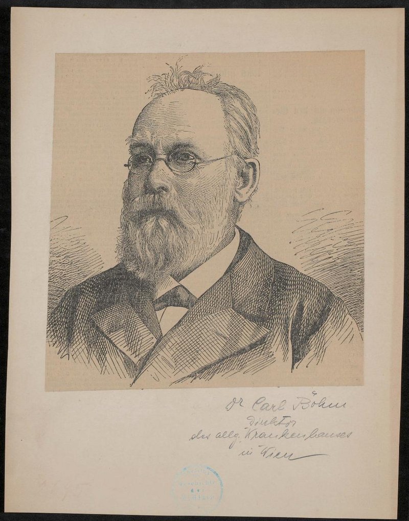 Der dazugehörige Text des Ausschnittes ist auf der Rückseite angebracht. Dieser bezieht sich auf die Einsetzung von Karl Böhm als neuen Direktor des Allgemeinen Krankenhauses, Wien. Die Vorlage des Bildes war eine Zeichnung. Unter dem Bild befindet sich ein Stempel des Institutes für Geschichte der Medizin, Wien.