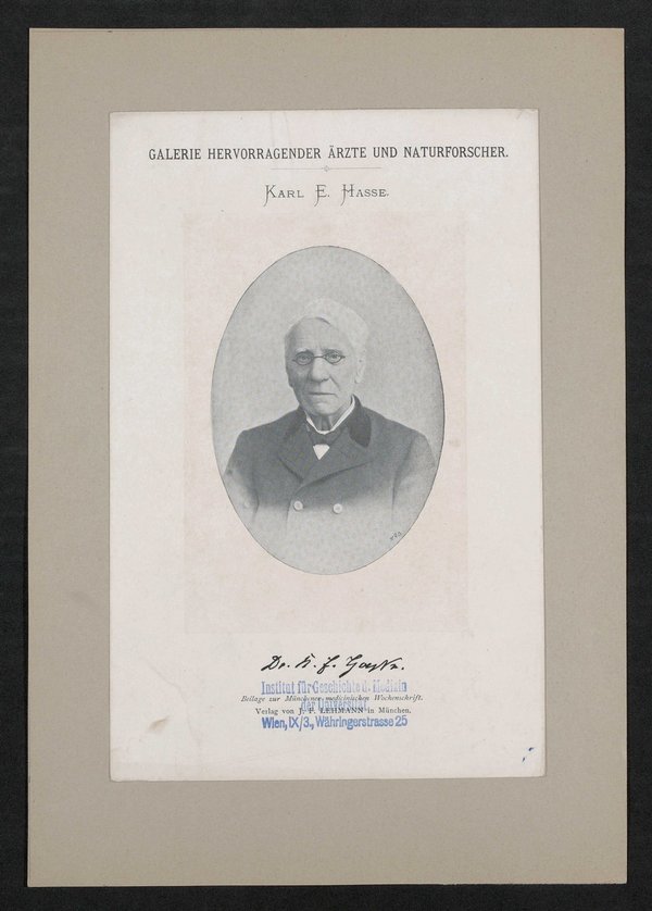 Auszug aus: Galerie hervorragender Ärzte und Naturforscher, in: Beilage zur Münchener medizinischen Wochenschrift. Das Bild wurde von Julius Friedrich Lehmann verlegt. Vorderseitig mit einem Stempel des Institutes für Geschichte der Medizin, Wien, versehen.