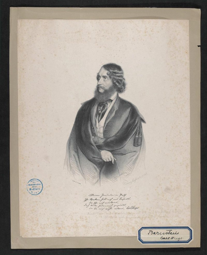 Die Lithografie wurde von August Prinzhofer angefertigt und von Johann Rauh gedruckt. Vorderseitig mit einem Stempel des Instituts für Geschichte der Medizin, Wien, versehen.