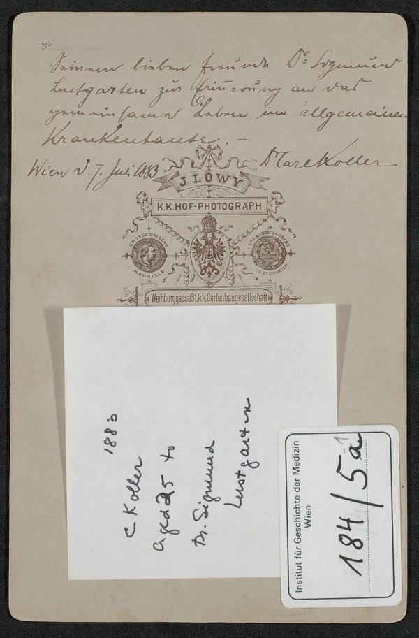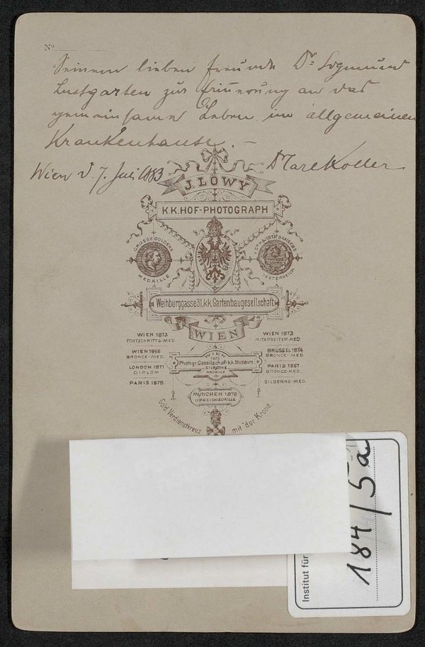 Die Fotografie wurde von Josef Löwy, Wien, 1883 angefertigt. Auf der Rückseite befindet sich eine Widmung an Sigmund Lustgarten. Neg I 47/20 Neg I 229/13,14