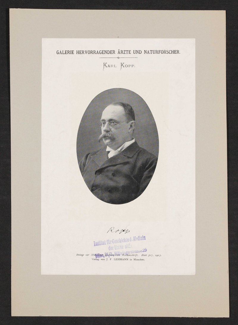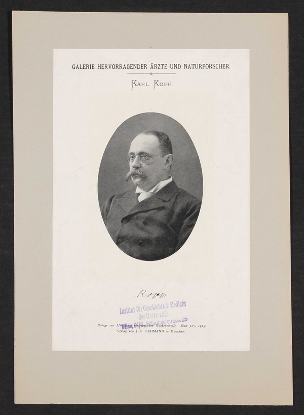 Auszug aus: Galerie hervorragender Ärzte und Naturforscher, in: Beilage zur Münchener medizinischen Wochenschrift, 1913, Bl. 317. Das Bild wurde von Julius Friedrich Lehmann verlegt. Vorderseitig mit einem Stempel des Institutes für Geschichte der Medizin, Wien, versehen.