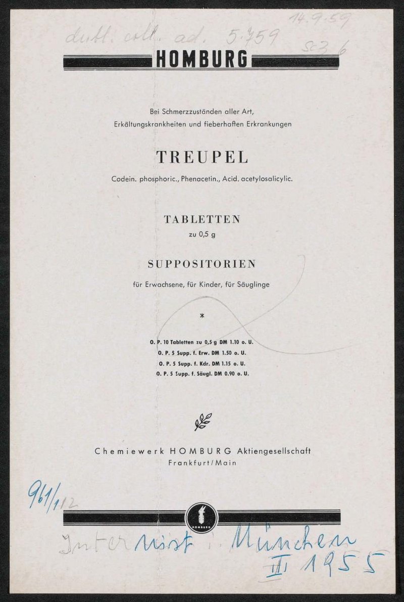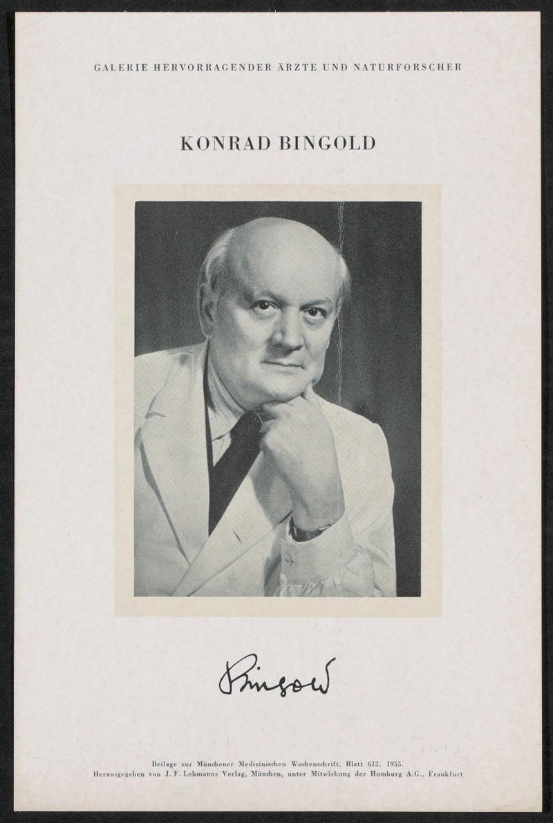 Mit lebensgeschichtlichen Informationen und Werbung für ein medizinisches Produkt auf der Rückseite. Auszug aus: Galerie hervorragender Ärzte und Naturforscher, in: Beilage zur Münchener medizinischen Wochenschrift, 1955, Bl. 612.