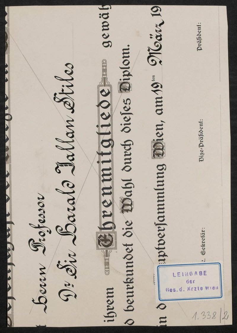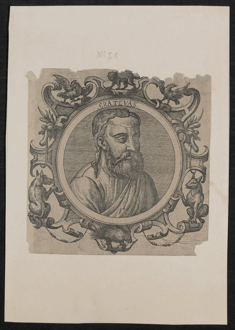 Unsignierte Radierung vermutlich aus: Johannes Sambucus, Icones veterum aliquot ac recentium medicorum philosophorumque elegiolis suis editae, opera Ioannis Sambuci, Antwerpen 1574 . Rückseitig befindet sich ein Stempel der Gesellschaft der Ärzte, Wien. Die Radierung ist auf einen Ausschnitt einer Ehrenmitgliedschafts-Urkunde der Gesellschaft der Ärzte, für Harald Jallan Stiles, fixiert.