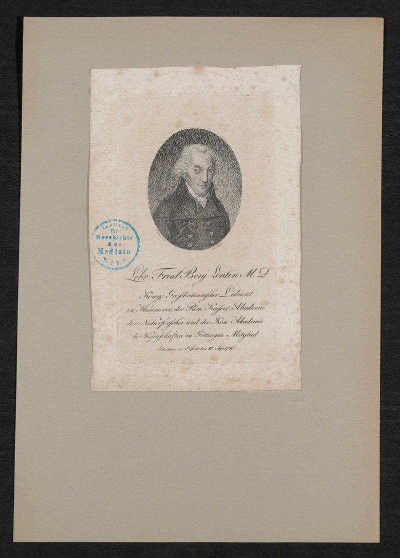 Der Kupferstich ist von Johann Daniel Laurenz junior auf Grundlage eines Gemäldes von Francis Arichall angefertigt worden. Vorderseitig mit einem Stempel des Instituts für Geschichte der Medizin, Wien, versehen.