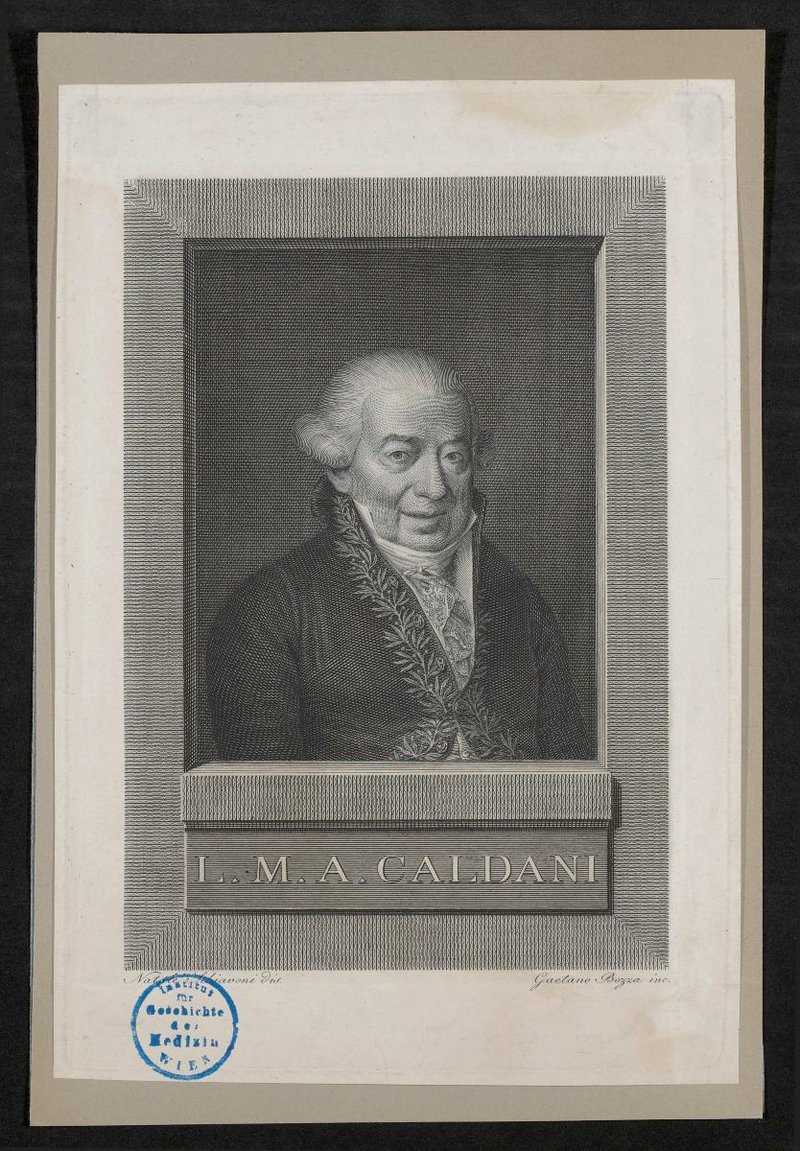 Der Kupferstich wurde von Gaetano Bozza nach einem Gemälde von Natale Schiavoni angefertigt. Vorderseitig mit zwei Stempeln des Institutes für Geschichte der Medizin, Wien, versehen.