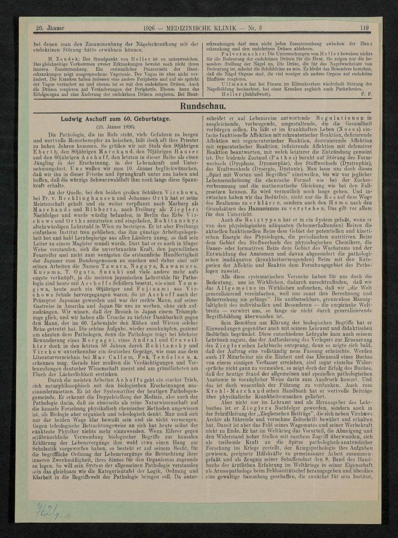 Auszug aus: Galerie hervorragender Ärzte und Naturforscher, in: Beilage zur Münchener medizinischen Wochenschrift, 1926, Bl. 369. Auf der Rückseite mit einem Bericht über die fachlichen Fertigkeiten anlässlich seines 60. Geburtstags, entnommen aus: Medizinische Klinik, Nr. 3, 20. Januar 1926, S. 119.