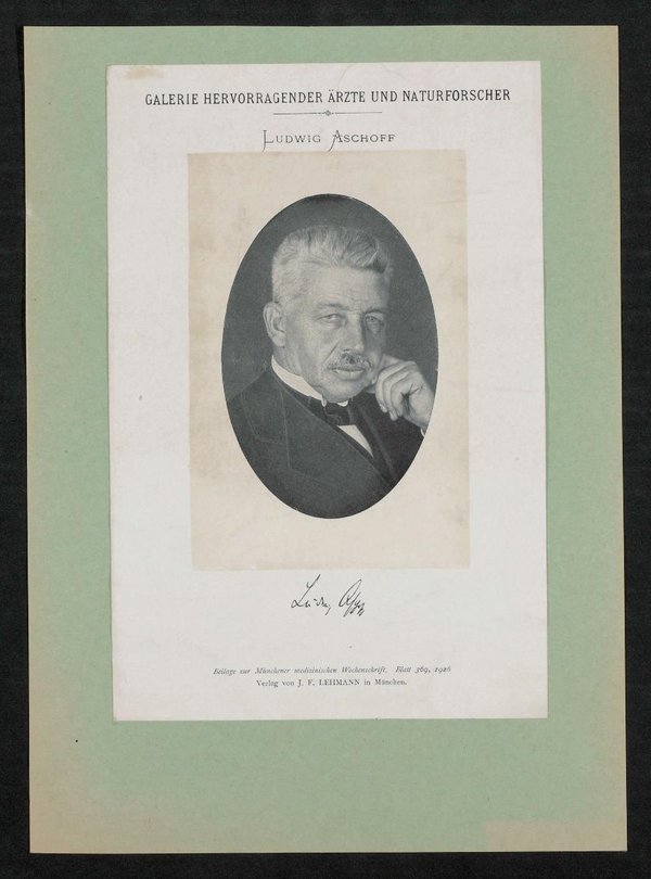 Auszug aus: Galerie hervorragender Ärzte und Naturforscher, in: Beilage zur Münchener medizinischen Wochenschrift, 1926, Bl. 369. Auf der Rückseite mit einem Bericht über die fachlichen Fertigkeiten anlässlich seines 60. Geburtstags, entnommen aus: Medizinische Klinik, Nr. 3, 20. Januar 1926, S. 119.