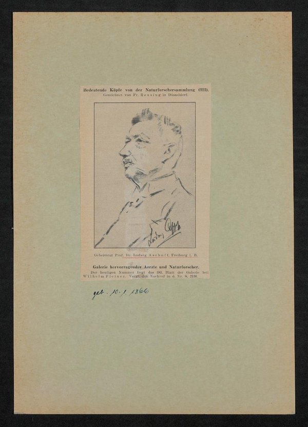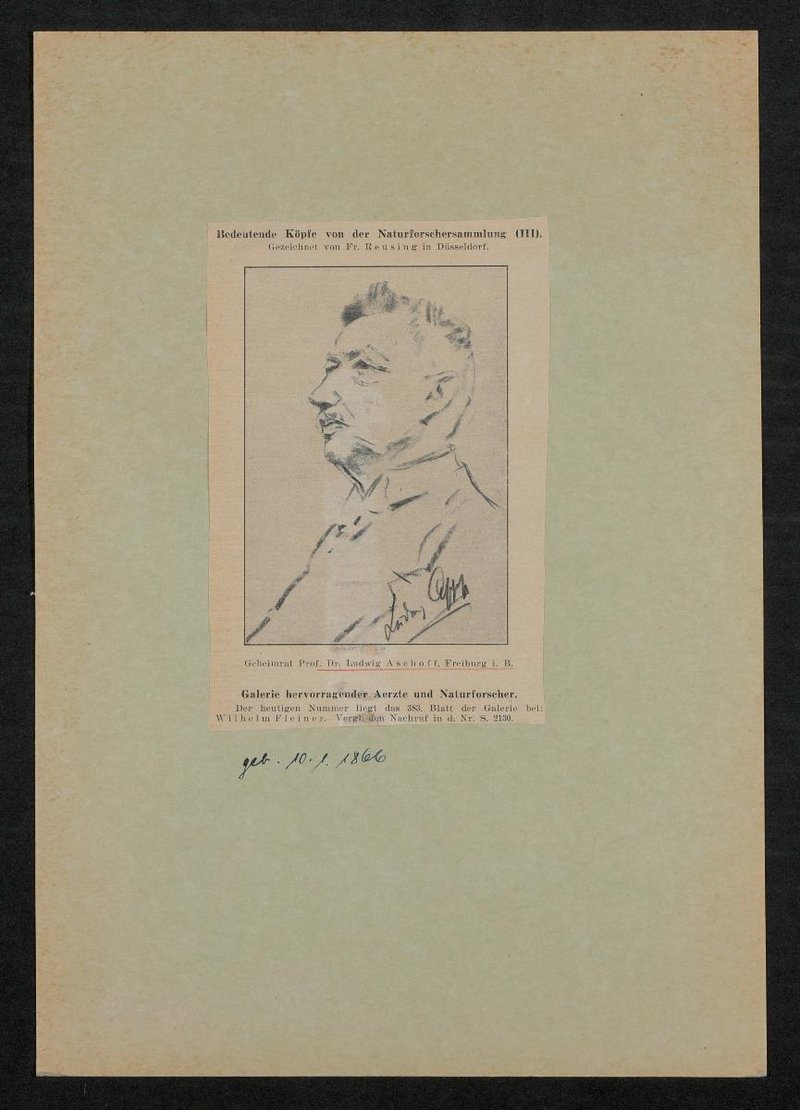 Die Zeichnung von Fritz Reusing, Düsseldorf, ist ist Teil der Serie Bedeutende Köpfe von der Naturforschersammlung III, aus: Münchener medizinische Wochenschrift, 1926, S. 2148.