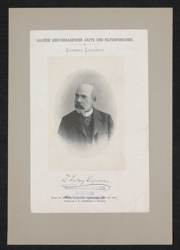 Auszug aus: Galerie hervorragender Ärzte und Naturforscher, in: Beilage zur Münchener medizinischen Wochenschrift, 1909, Bl. 240. Vorderseitig mit einem Stempel des Instituts für Geschichte der Medizin, Wien, versehen.