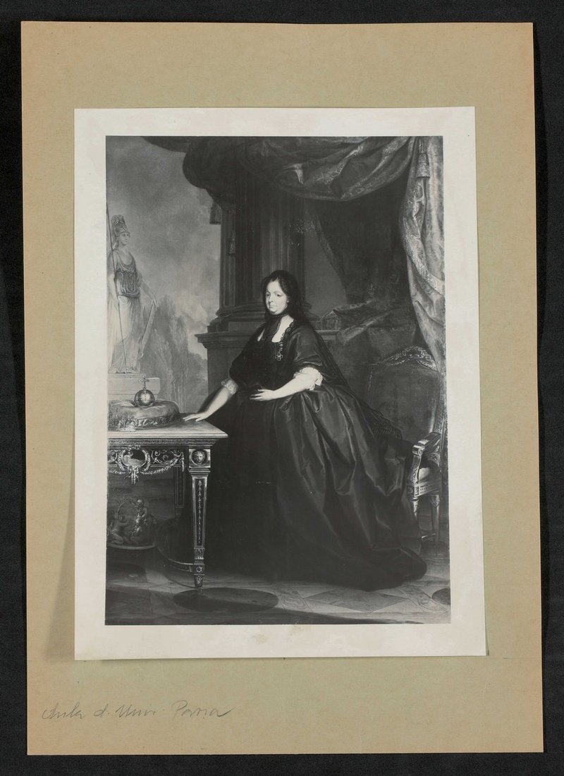 Das Bild ist eine Kopie eines unsignierten Gemäldes von Maria Theresia. Zum Zeitpunkt der Anfertigung der Kopie befand sich das Gemälde in der Aula der Universität Pavia und wurde von Guglielmo Chiolini fotografiert.