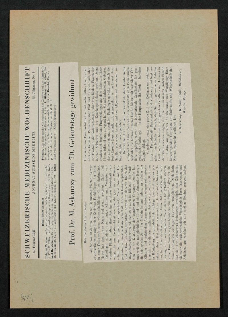 Bild und Bericht sind der Schweizerischen Medizinischen Wochenschrift, Nr. 8, 65. Jg., 23. Februar 1935, entnommen worden. Mit einem Bericht von Schweizer Kolleg:innen über seine fachlichen Fertigkeiten auf der Rückseite.