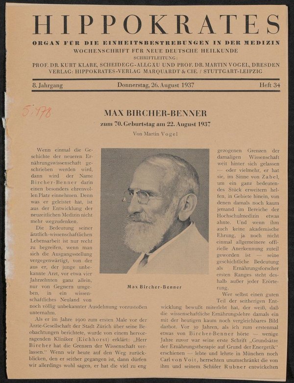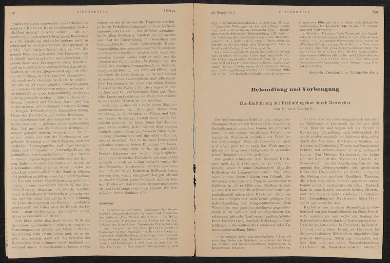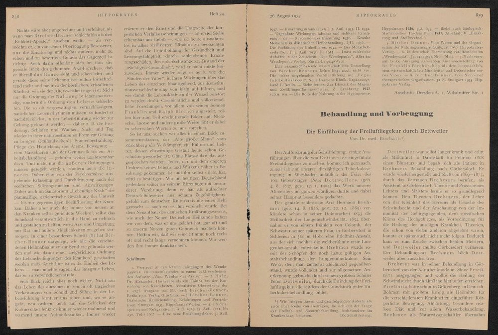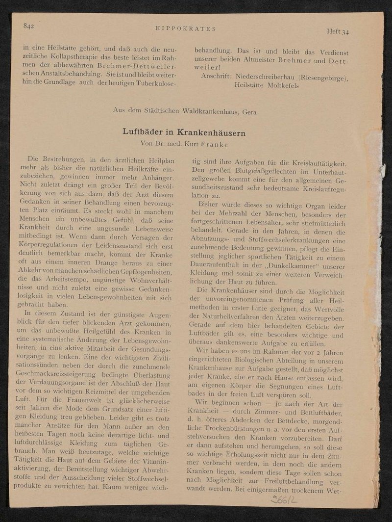 Bild und Bericht sind der Fachzeitschrift Hippokrates. Organ für die Einheitsbestrebungen in der Medizin. Wochenschrift für neue deutsche Heilkunde, 8. Jg., Heft 34, 26. August 1938, S. 833-839, entnommen worden. Neg III 14/4 Neg (9x12) 1035