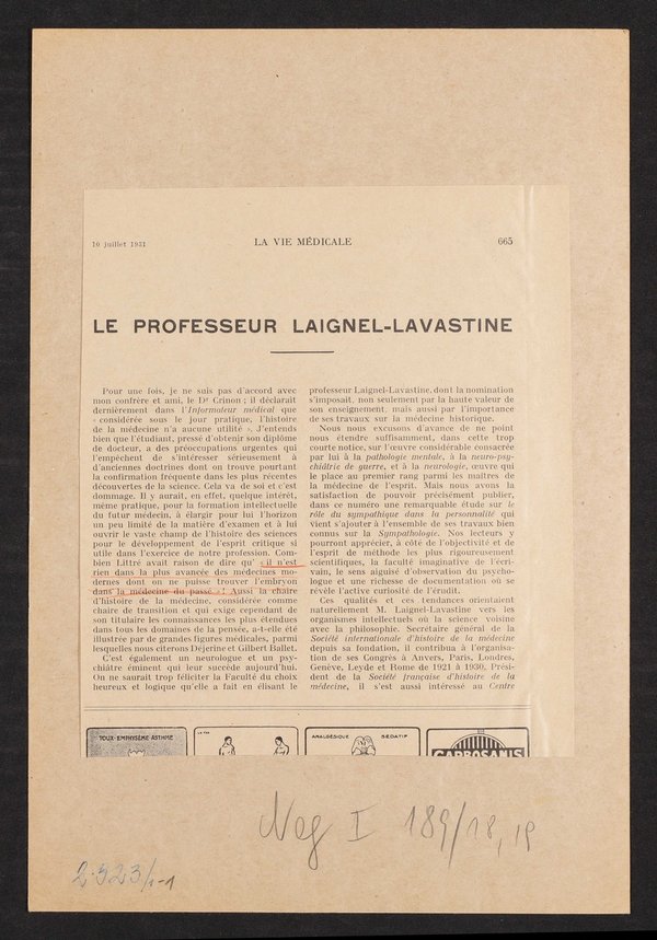 Auszug aus: La Vie Médicale, 10. Juli 1931, S. 665. Die Originalfotografie stammt aus dem Photostudio Lutetia, Paris. Mit einem Bericht über die fachlichen Fertigkeiten auf der Rückseite.