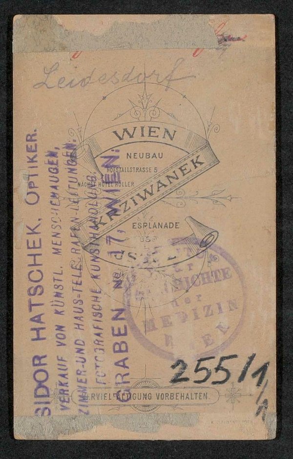 Die Fotografie wurde von Rudolf Krziwanek, Wien, angefertigt. Mit rückseitigen Stempeln von Isidor Hatschek, Optiker, Wien, und dem Institut für Geschichte der Medizin, Wien. Neg III 105/3