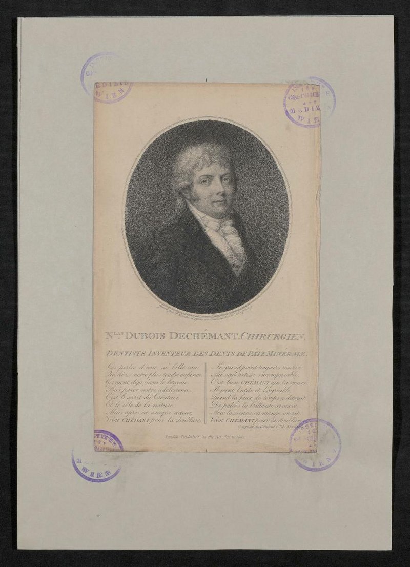 Der Kupferstich wurde von Peter Condé nach einem Gemälde von Chr. Dufretay angefertigt. Vorderseitig mit vier Stempeln des Institutes für Geschichte der Medizin, Wien, versehen.